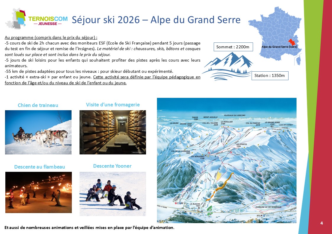 -Un séjour ski, lors des vacances d’hiver, pour les jeunes de 8 à 17 ans avec comme objectif de découvrir le milieu montagnard et d’apprendre les sports de glisse,